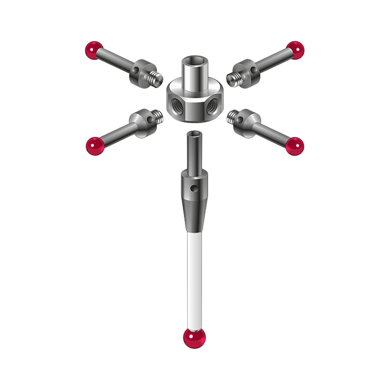 Star stylus: It consists of four or five ruby ball systems firmly installed on a stainless-steel star stylus base. This type of stylus can be used to measure various different shapes and structures. It is designed for multi-tip detection of complex shapes and holes. Its calibration uses multiple probes, so it can minimize the movement of the probe and measure side holes or slots, etc. It is calibrated in the same way as a spherical probe. Disc stylus: A probe in the shape of a disc made by cutting off the middle part of a ball. Since the cross-section of the disc is spherical, the calibration principle is the same as that of a spherical probe. It measures using the outer diameter part or the thickness part. It is used for holes, internal relief grooves, and recesses that cannot be reached by star styli, such as the dimensions between bottleneck surfaces, the width or shape of slots, etc. It is more convenient to calibrate using a ring gauge.
