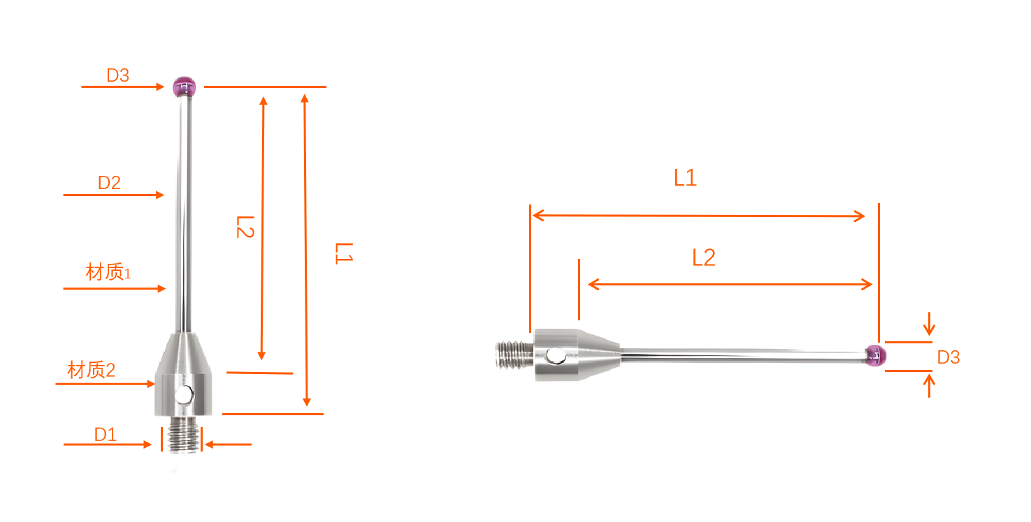 | Probe model | Screw thread | Material 1 | Material 2 | Length L1 | Diameter D1 | Diameter D2 | Diameter D3 | Contact shape |